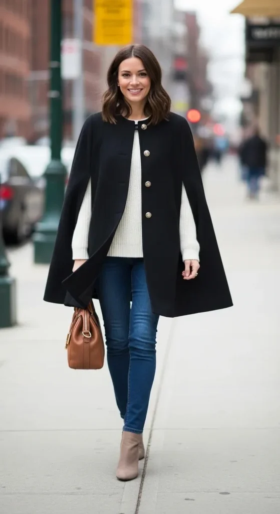 A classic black wool cape paired with skinny jeans is one of the easiest ways to add drama without overthinking your look. Start with a slim white or gray sweater to keep the base fitted. Add dark skinny jeans to create balance against the volume of the cape. Finish with ankle boots in leather or suede. If you are shopping on a budget, check thrift stores for oversized wool coats that can be reshaped into a cape by a local tailor. Keep accessories structured, like a firm handbag and simple studs. This outfit works for coffee dates, office days, or casual dinners. Stick to clean lines and avoid bulky layers underneath so the cape hangs smoothly. A bold lip color can add contrast without costing a thing. It is simple, practical, and timeless.