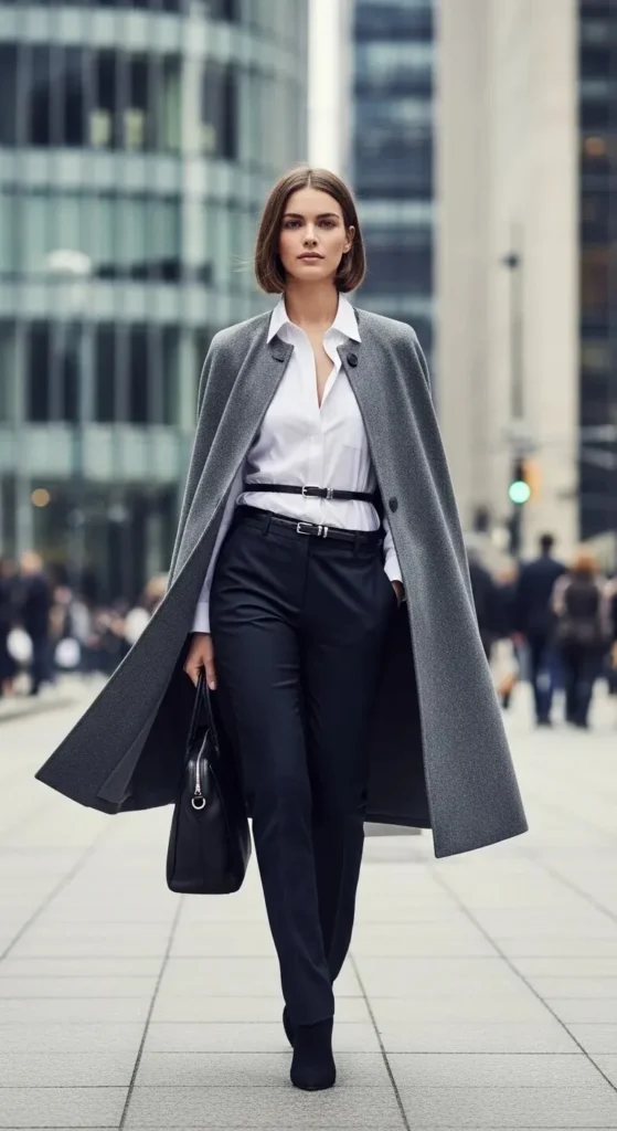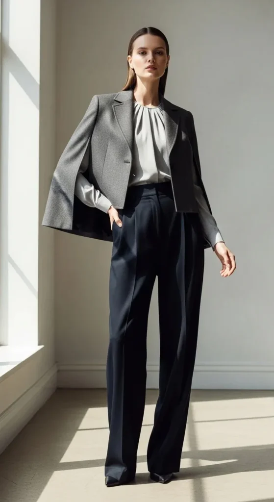 A gray cape works perfectly in a work setting. Layer it over tailored trousers and a crisp button-down shirt. Choose slim cuts underneath to keep the outfit sharp. Add loafers or low heels for comfort during long days. Gray is neutral, so it pairs well with black, white, or soft blue. Look for wool-blend options during sales for better pricing. Keep jewelry simple and structured. Avoid large patterns that distract from the clean shape. A structured handbag completes the professional feel. This outfit feels polished but not stiff. It is practical and easy to repeat throughout the season. A gray cape adds drama while staying appropriate for meetings and presentations.