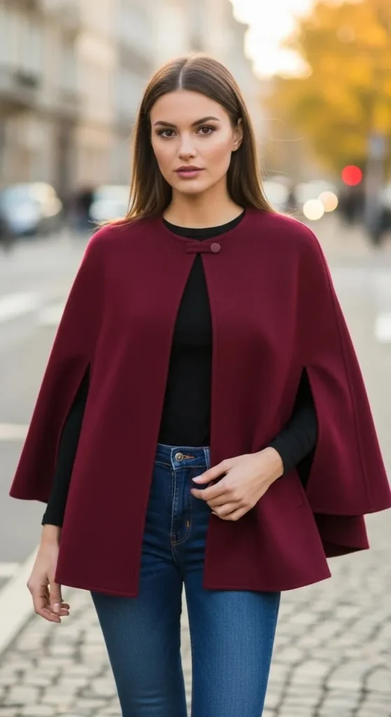 A burgundy cape adds richness to dark denim. Pair it with a fitted black or gray top to keep the color grounded. Choose dark wash jeans for a polished finish. Add black boots and a matching bag. Burgundy works beautifully in fall and winter. Search resale platforms for affordable wool options. Keep jewelry subtle. This outfit feels bold without being loud. The deep shade provides drama while denim keeps it approachable. It is ideal for dinners, casual gatherings, or evening walks. Stick to simple silhouettes to let the color stand out naturally.