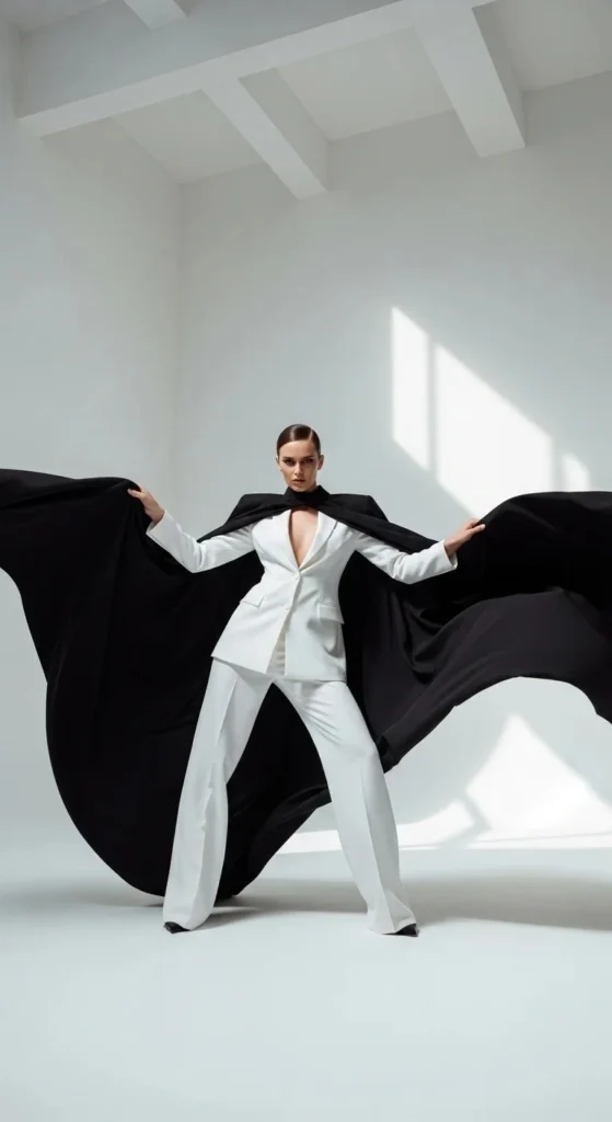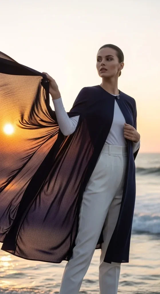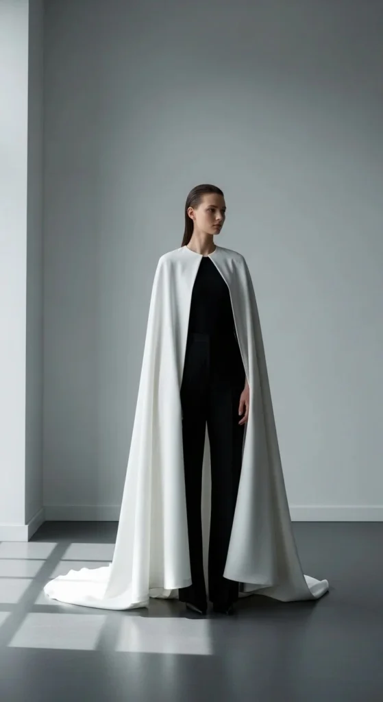 A black cape over an all-white outfit creates high contrast. Choose white trousers and a fitted white top as your base. Keep fabrics thick enough to avoid transparency. Add black heels or boots to tie the look together. Minimal silver or gold jewelry works well here. This outfit is perfect for formal dinners or creative events. Avoid extra patterns and keep the lines sharp. If buying new pieces is not possible, start with white basics you already own and invest only in the cape. The strong contrast creates instant impact.