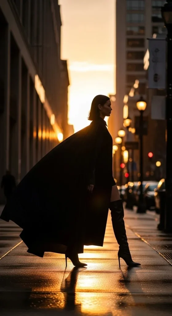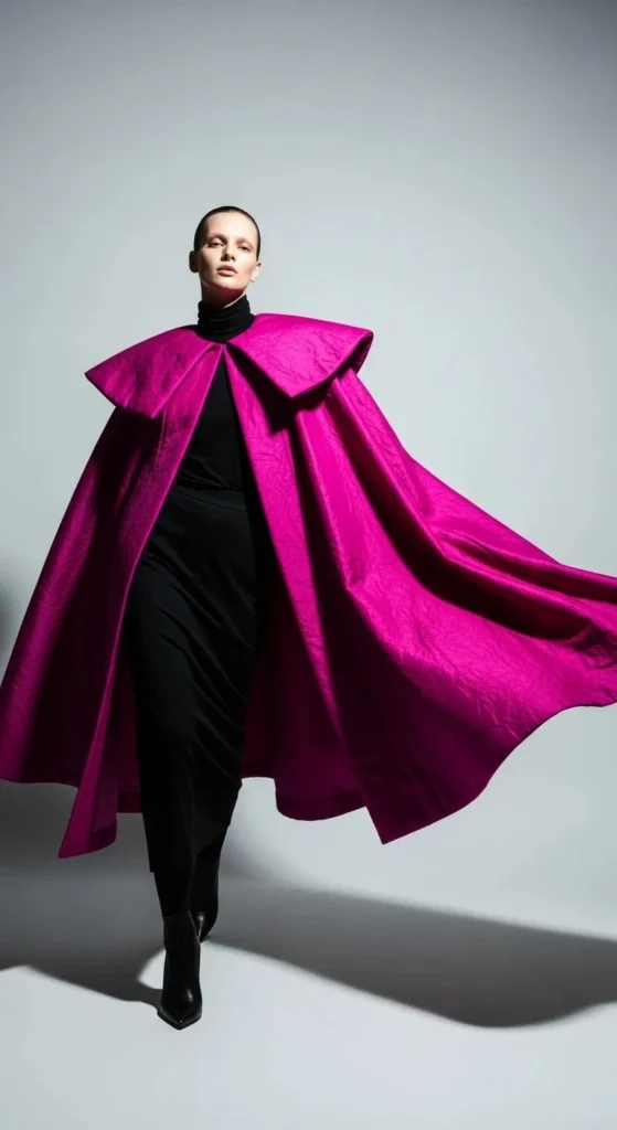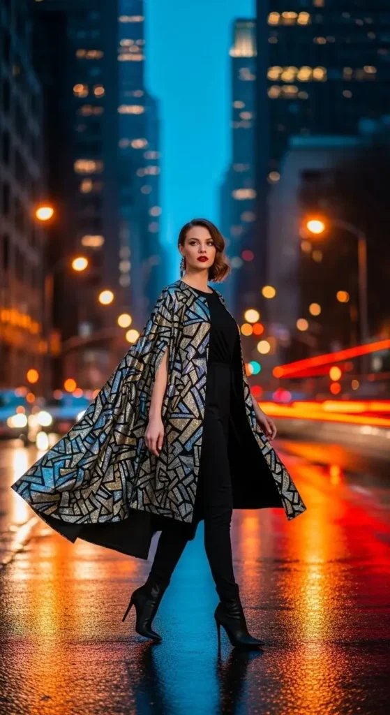 A statement cape in a bold color or dramatic cut works best with a minimal base. Choose black trousers and a fitted top. Keep accessories subtle. Let the cape take center stage. If you are experimenting, start with an affordable option before investing in high-end pieces. This outfit is perfect for events where you want attention without complicated styling. Avoid mixing competing colors. Simple foundations allow dramatic outerwear to shine. One strong piece is often all you need.