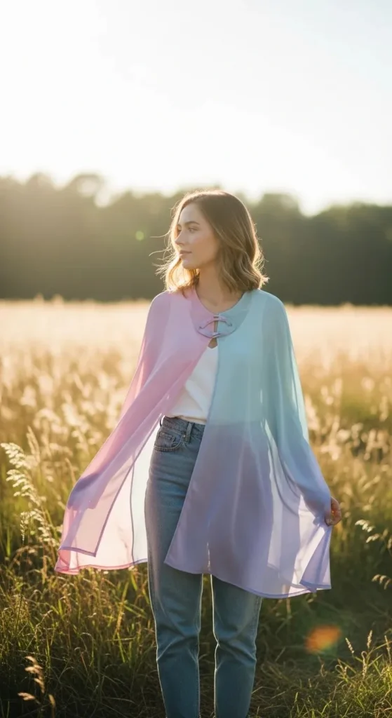 A pastel cape paired with light wash jeans feels soft and approachable. Choose a white or cream top underneath. Add neutral sneakers or flats for comfort. Pastels work well in spring. Look for lightweight fabrics to avoid bulk. Keep accessories subtle and in similar tones. This outfit is great for daytime outings or casual meetings. Avoid dark heavy shoes that clash with the softness. The light denim keeps the outfit relaxed while the cape adds flair.