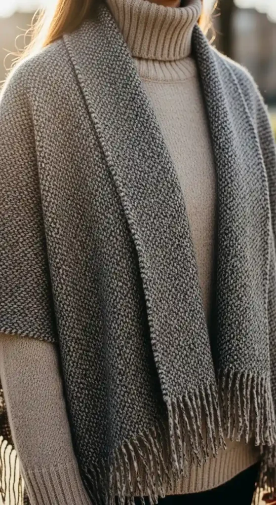 A knit cape feels relaxed yet polished. Pair it with a fitted sweater dress to keep the base streamlined. Add tall boots for warmth and structure. Neutral tones like gray, cream, or taupe are easy to mix with existing pieces. Knit capes are often affordable and widely available during colder months. You can also repurpose an oversized knit scarf as a shoulder wrap. This outfit works for casual outings or weekend plans. Keep accessories minimal and practical. Choose a medium-sized handbag to maintain proportion. Avoid oversized layers underneath so the knit drapes naturally. This look is comfortable but still stylish. It proves that drama does not have to feel formal. With the right proportions, even cozy pieces can look refined.