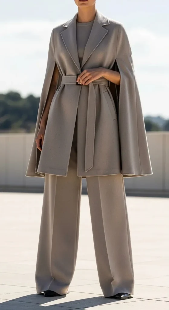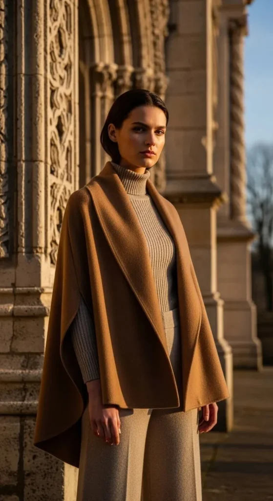 A textured cape adds depth to neutral outfits. Pair it with cream or beige knitwear and tailored pants. Keep everything in soft tones to highlight the fabric. Look for boucle or ribbed textures at affordable stores. Minimal jewelry works best. This outfit feels refined yet easy to recreate. Avoid mixing too many textures at once. Let the cape stand out.