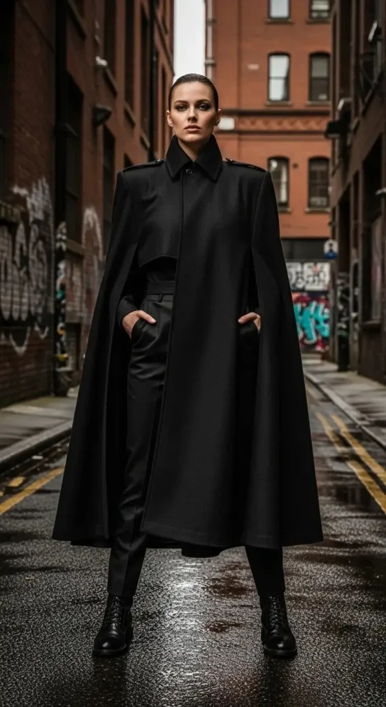 A military-inspired cape with structured shoulders creates strong lines. Pair it with dark trousers and black boots. Keep the base fitted. Look for button details or subtle hardware. Avoid adding extra bold accessories. This style works for cooler seasons. Search resale shops for structured pieces at lower prices. The sharp lines create drama without bright colors.