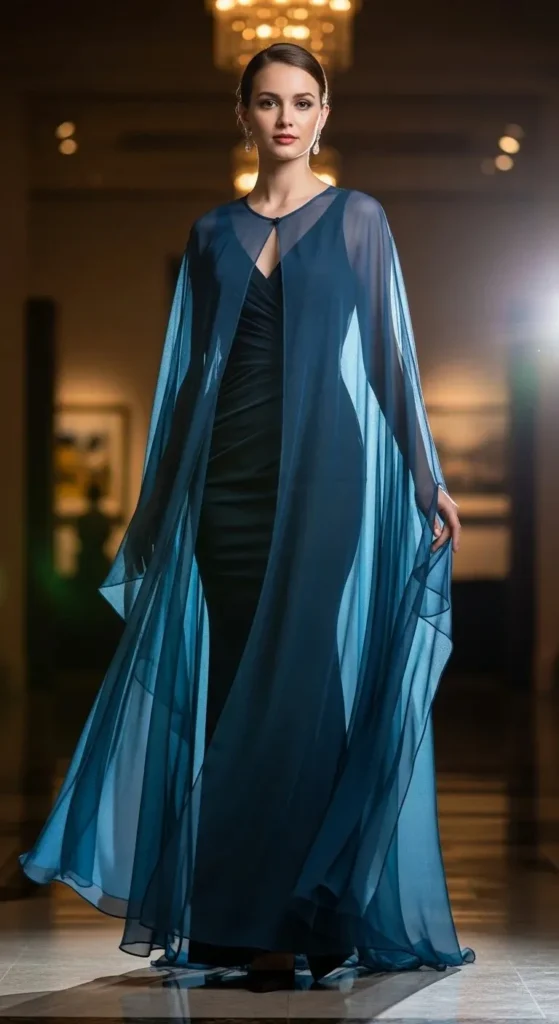 A sheer cape layered over a cocktail dress adds soft movement. Choose neutral or matching shades. Keep the dress simple. Add delicate heels and minimal jewelry. Sheer fabrics are often affordable and easy to drape. This look works for weddings or formal dinners. Avoid heavy layers underneath. The lightweight fabric creates graceful motion.
