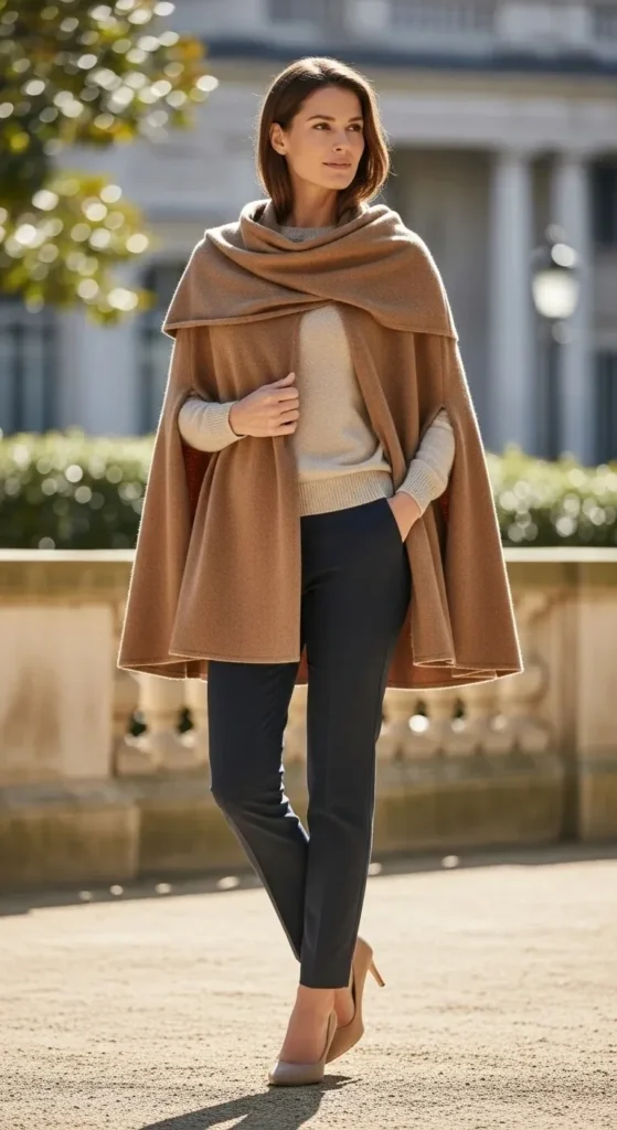 A cashmere cape feels soft and refined. Pair it with tailored pants and a slim sweater. Stick to neutral tones for flexibility. If cashmere feels out of reach, try a soft wool blend instead. Keep shoes polished and simple. This outfit works for meetings or dinners. Avoid busy patterns. The fabric itself makes the statement.