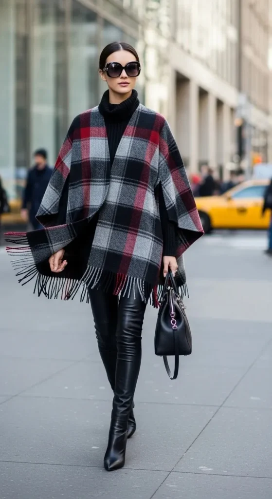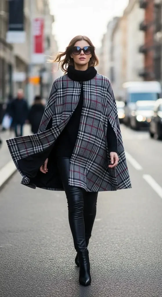 A plaid cape adds personality and texture to your wardrobe. Start with a fitted black turtleneck and faux leather leggings to keep the base sleek. The darker layers ground the pattern and prevent the outfit from looking busy. Faux leather leggings are widely available at affordable prices and instantly add edge. Choose black ankle boots to keep everything cohesive. If you already own a plaid blanket scarf, drape it evenly over your shoulders to recreate the cape effect. Oversized sunglasses and a crossbody bag complete the look. This outfit works well for fall outings, shopping days, or relaxed dinners. Keep jewelry minimal and avoid mixing additional prints. The focus should stay on the plaid. It feels bold yet wearable and can be styled with pieces you likely already own.