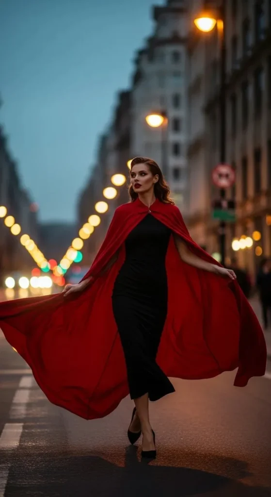 A red cape brings confidence to a simple black dress. Choose a knee-length or midi black dress with a fitted cut. The sleek base allows the bold color to stand out without overwhelming the look. Add black heels or ankle boots to keep attention on the cape. If a full red cape feels expensive, search resale shops or seasonal sales. Even a structured red shawl can create a similar effect. Keep jewelry understated and let the color carry the outfit. This works beautifully for date nights or evening events. A red lip can tie everything together without adding cost. Avoid mixing additional bright tones. Stick to black accessories for balance. This outfit proves that one bold piece can completely change a simple wardrobe staple.