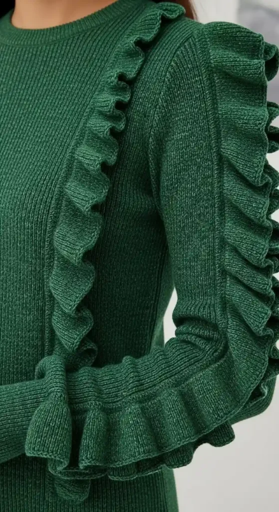 Ruffles add a playful, romantic touch to standard knitwear. Look for ruffles on the shoulders or cuffs for a subtle look. Stick to solid colors to prevent the ruffles from looking too busy.