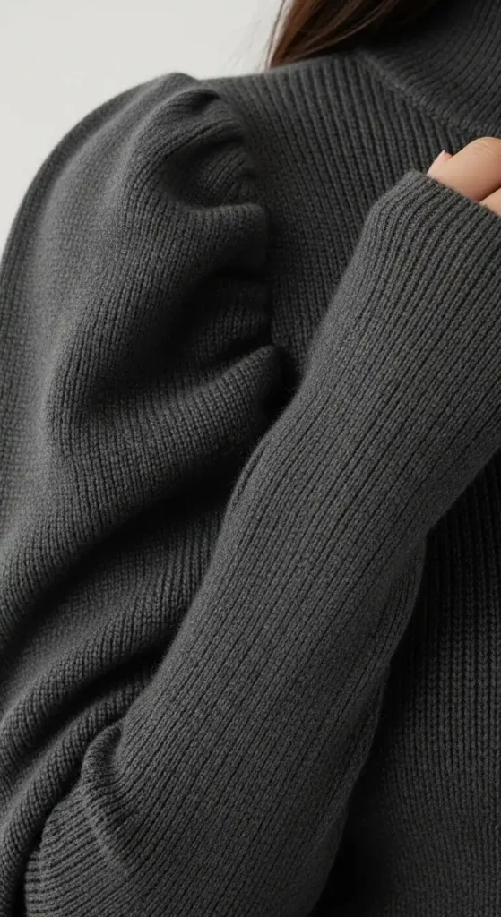 Puff shoulders add a bit of structure to soft knitwear. They give the illusion of broader shoulders and a smaller waist. Choose a knit with a bit of spandex to help the puffs hold their shape.