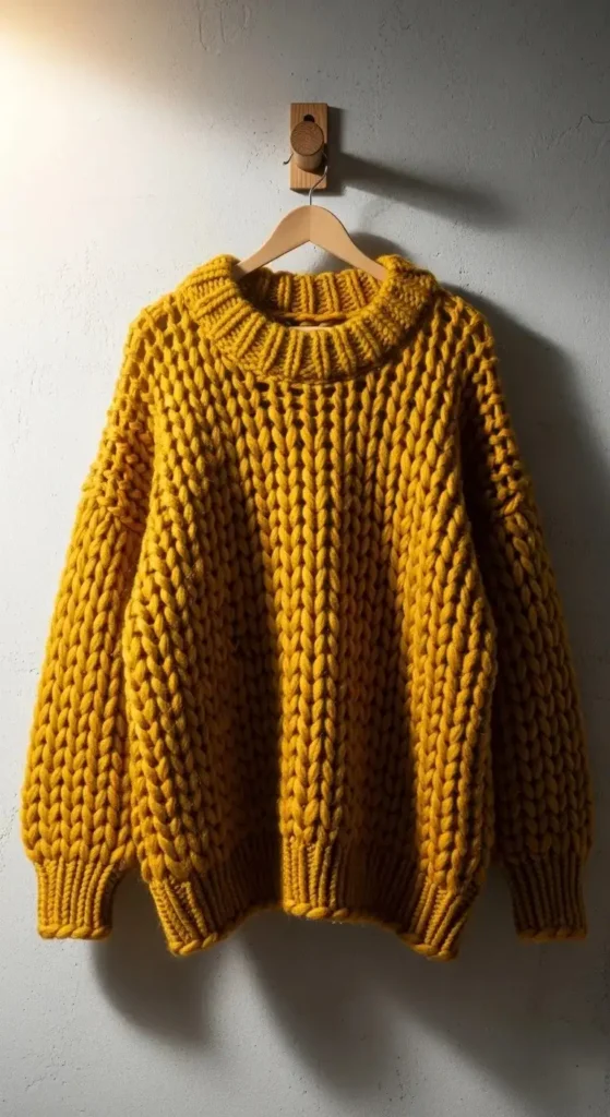 [Image Prompt: An oversized, mustard-yellow chunky knit sweater hanging on a wooden peg. The knit is loose and airy but thick. Natural light hits the yellow yarn.]