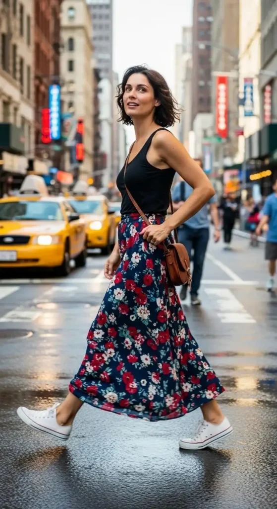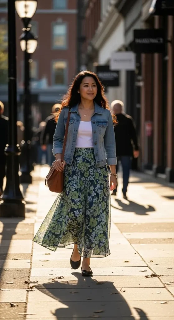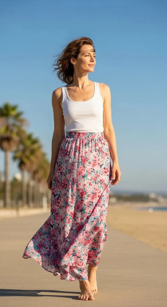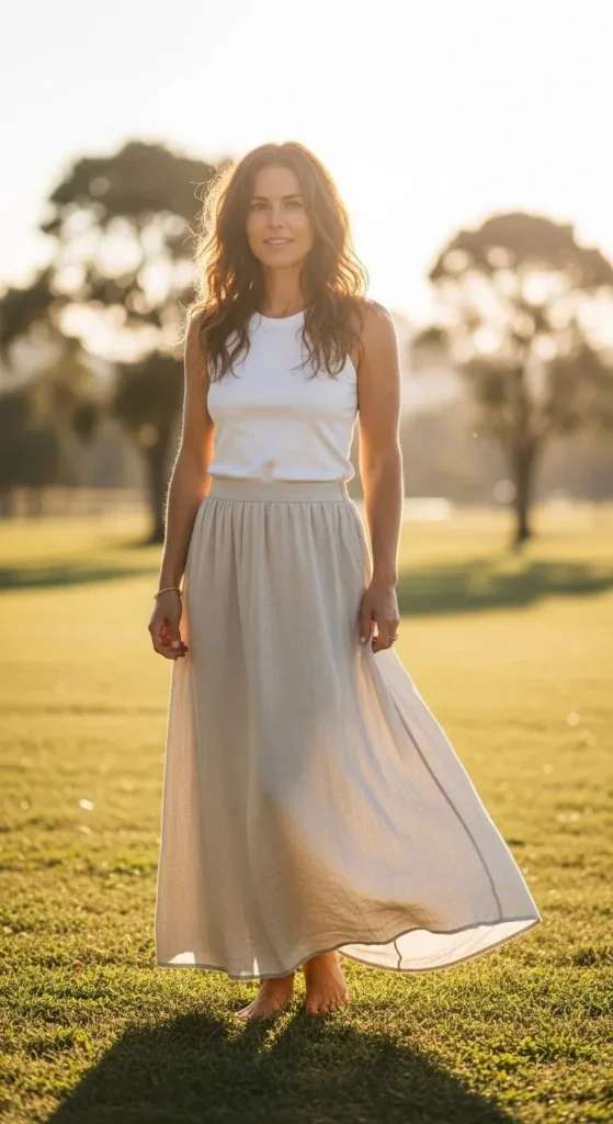 If your tee feels plain, knot it slightly at the hem. That small move adds shape without effort. Thrift stores are gold for maxi skirts with movement. Look for elastic waists. They’re forgiving and comfortable all day.