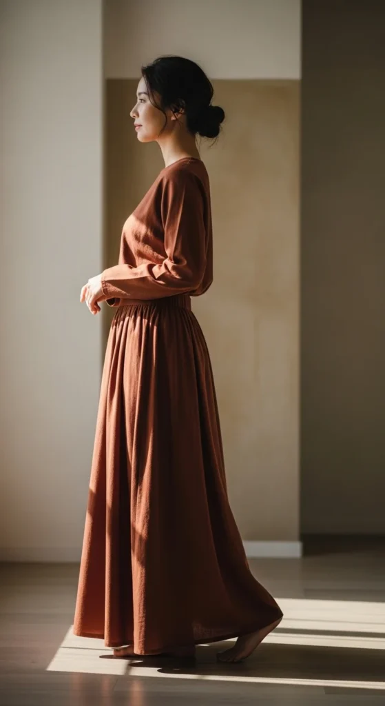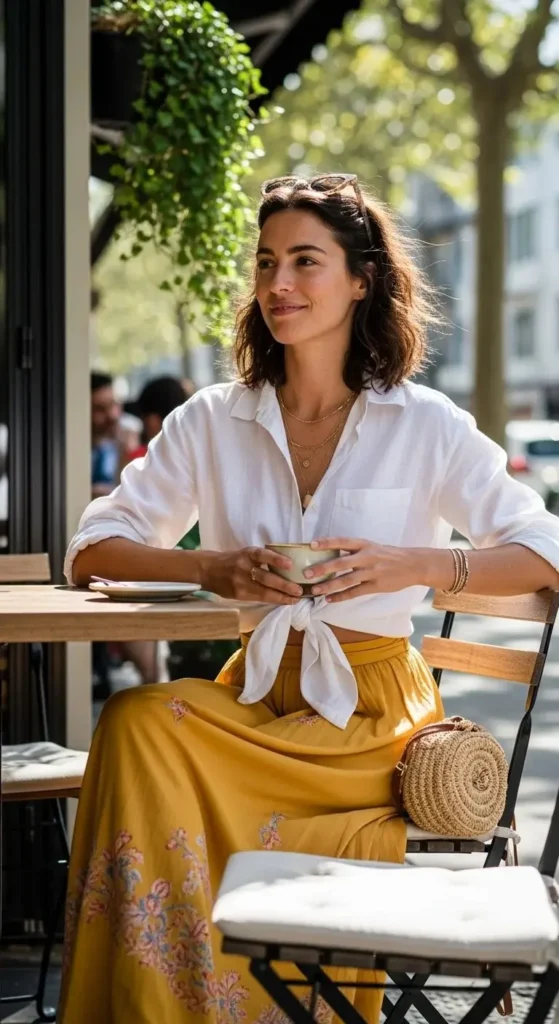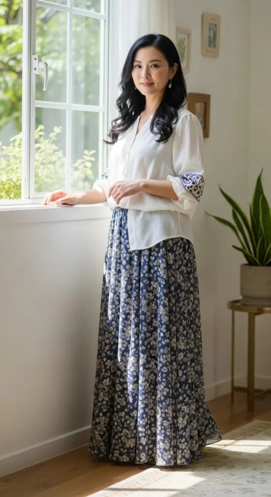 This pairing works because it feels natural. Start with a basic tee you already own. White, black, or soft beige always work. Tuck it in loosely to define the waist. Add a flowing maxi skirt in cotton or jersey. Flat sandals or canvas sneakers keep it grounded.