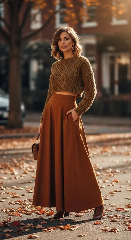 A cropped sweater balances a long skirt perfectly. The key is waist placement. High-waisted skirts keep everything proportioned.