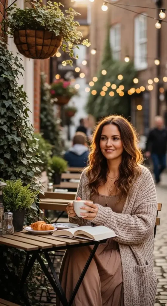 Choose soft knits. Nothing bulky. Neutral shades keep it wearable. Add ankle boots or loafers depending on the weather.