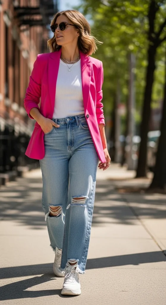 This combination balances professional structure with casual comfort. A hot pink blazer adds immediate energy to a basic white tee and jeans. It is a perfect choice for a lunch date or a creative office.