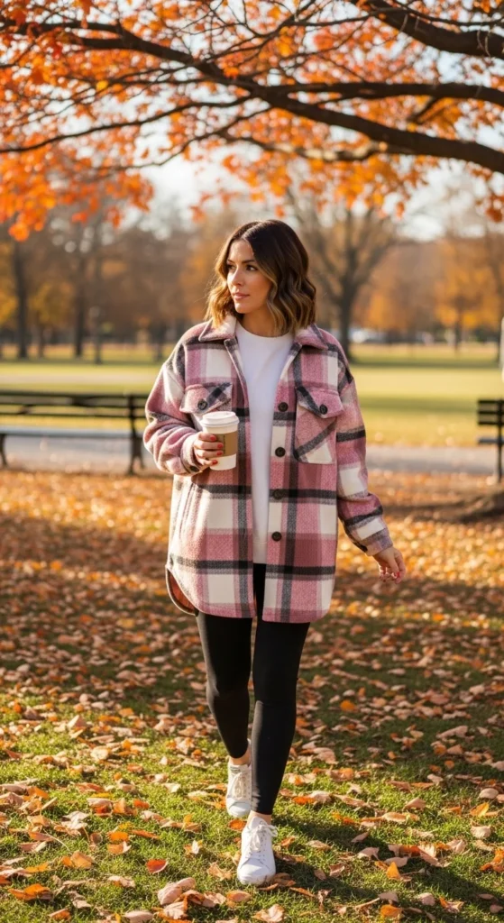 The pink shacket is a must-have for layered autumn style. It combines the look of a flannel shirt with the warmth of a jacket. A pink plaid or solid pink shacket looks great over basic black leggings.