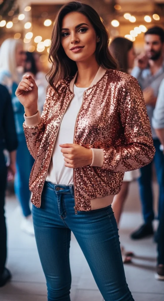 A rose gold sequin jacket is the ultimate “party” piece. While it looks expensive, it is a great way to dress up basic items like blue jeans. The pinkish metallic tone feels warmer and more modern than silver or gold.