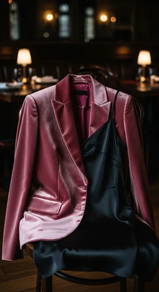 For a luxurious evening look, try a pink velvet blazer. The soft texture of the velvet adds a layer of sophistication to a delicate slip dress. It is a great way to stay warm during a formal dinner or event.