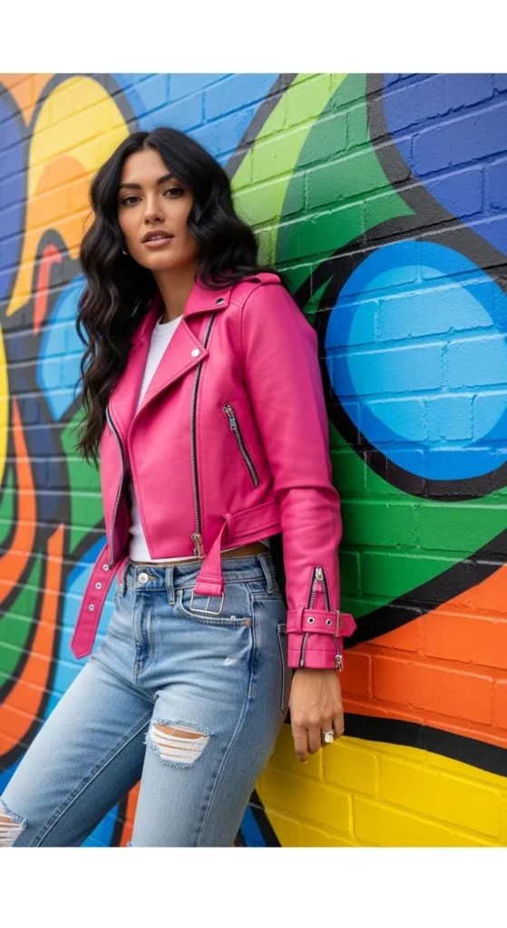 The pastel pink biker jacket offers a softer take on the classic leather look. When paired with an all-black base, the pink color really pops. This creates a striking contrast that feels both feminine and tough.