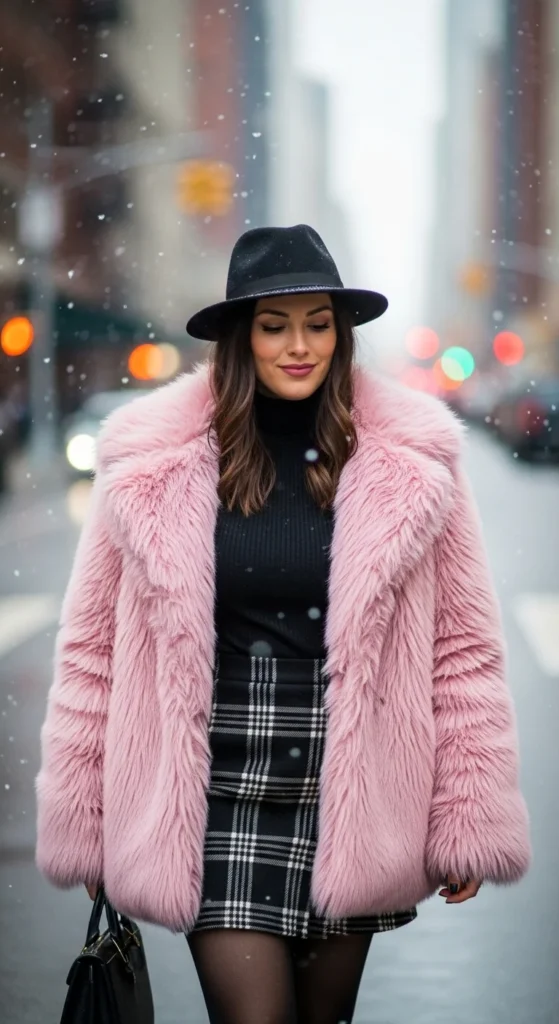 A pink faux-fur coat is a fun way to embrace “maximalist” fashion. It is incredibly warm and makes a huge visual impact. Pairing it with a mini skirt and tights keeps the look youthful and balanced.