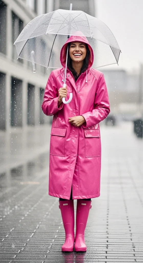 Pair this with your favorite rain boots or “wellies.” It is a fun, practical look for commuting or outdoor activities. The bright pink color is also a great safety feature, making you more visible to drivers in low light.