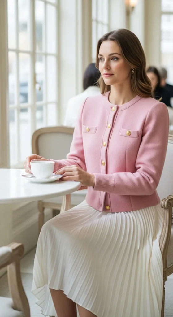 The pink cardigan jacket offers a “lady-like” aesthetic similar to classic tweed styles. It provides the comfort of a sweater with the structure of a jacket. It looks very polished when paired with a pleated midi skirt.