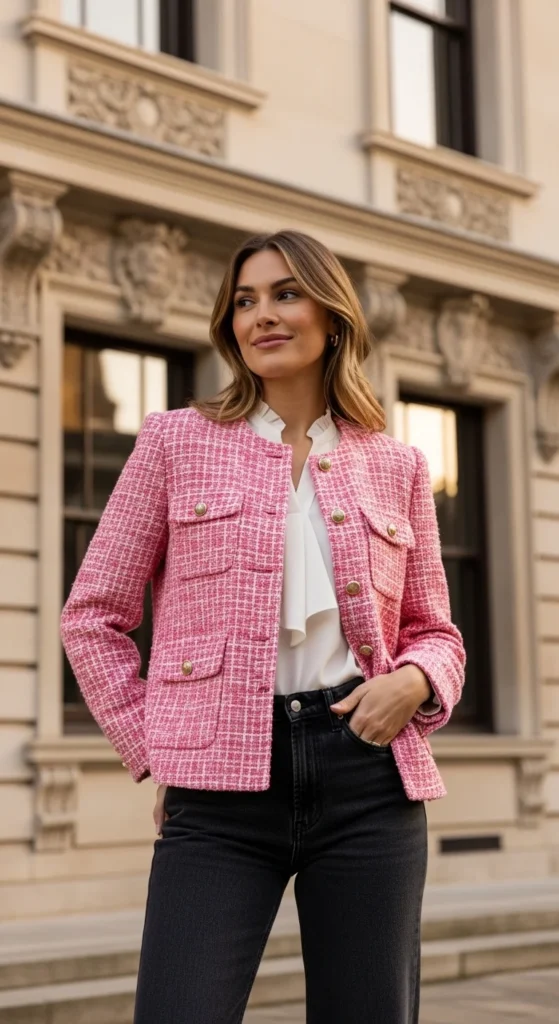 A pink tweed jacket brings a touch of classic French style to your closet. The textured fabric adds a layer of sophistication to everyday denim. It is a great way to make a casual outfit feel more refined.