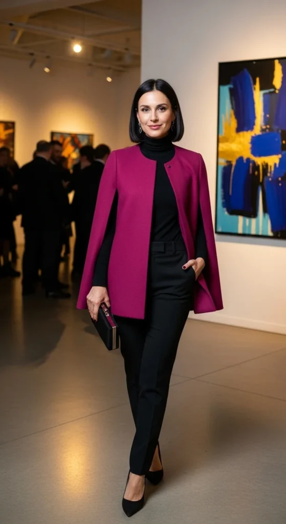 The magenta cape jacket is a unique silhouette that feels very high-fashion. The open sleeves allow for easy movement while the bold color makes a strong impression. It looks best over a slim, monochromatic base.