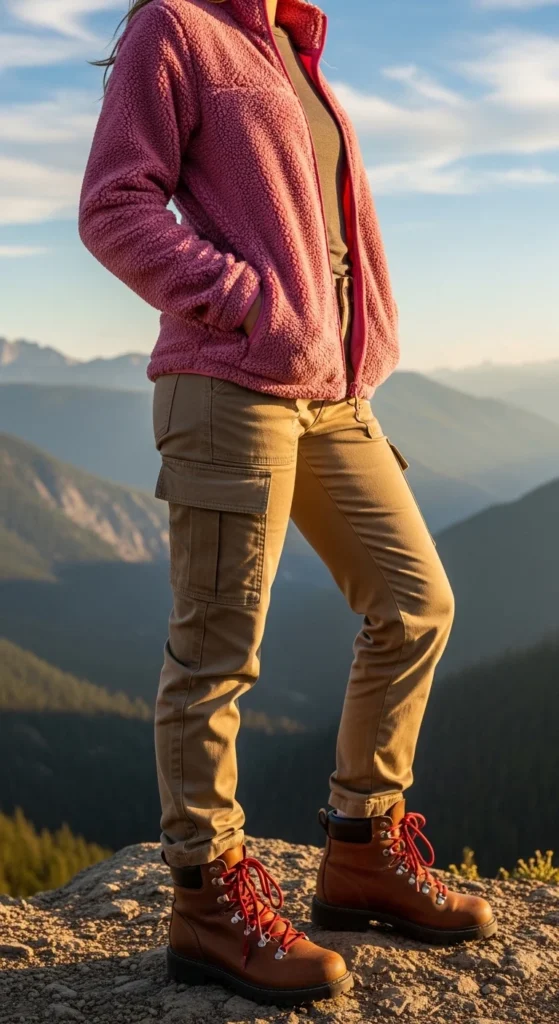 For a trendy, outdoor-inspired look, try a pink fleece jacket. The soft, fuzzy texture is incredibly cozy and adds a pop of color to rugged cargo pants. It is a great example of “gorpcore” fashion.