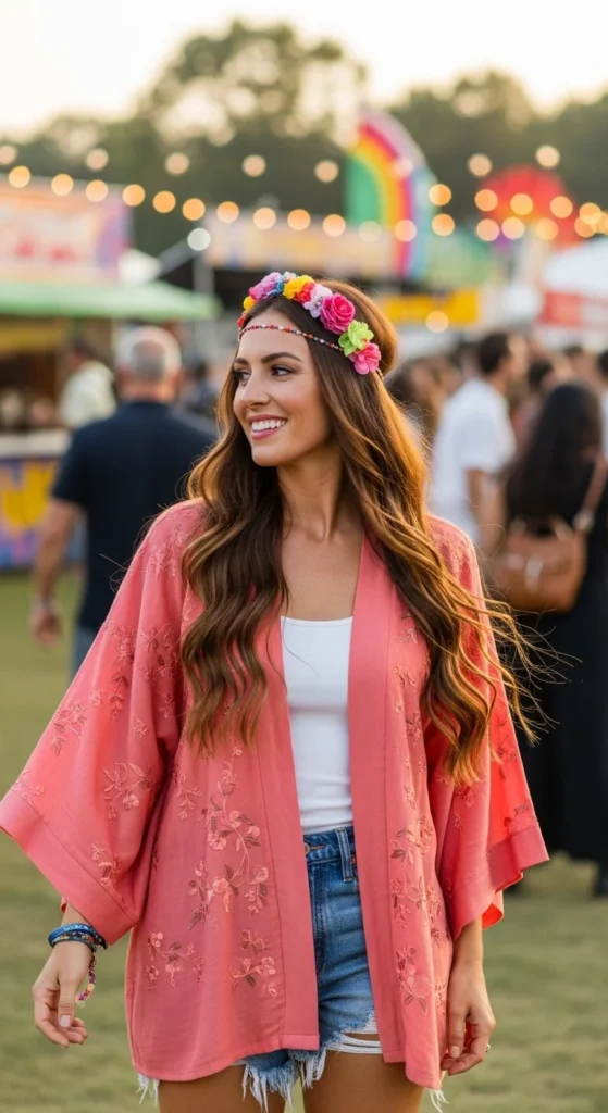A salmon pink kimono jacket is a lightweight, airy layer perfect for summer. Its long, flowing shape adds movement to a basic shorts and tank top combination. The soft salmon tone is very flattering on most skin tones.
