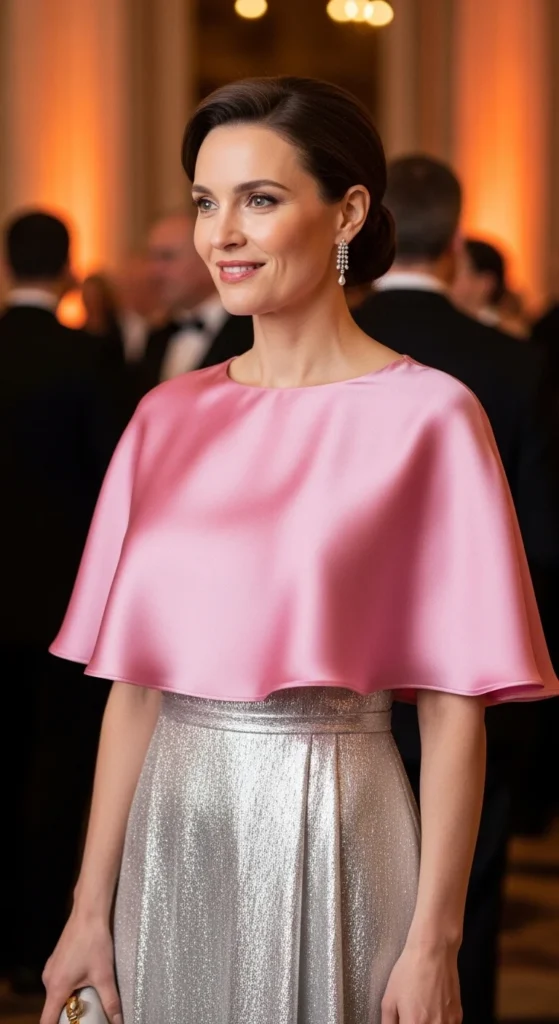 A pink capelet is a vintage-inspired way to add color to formal wear. It provides a touch of modesty and warmth for the shoulders without hiding the beauty of an evening gown.
