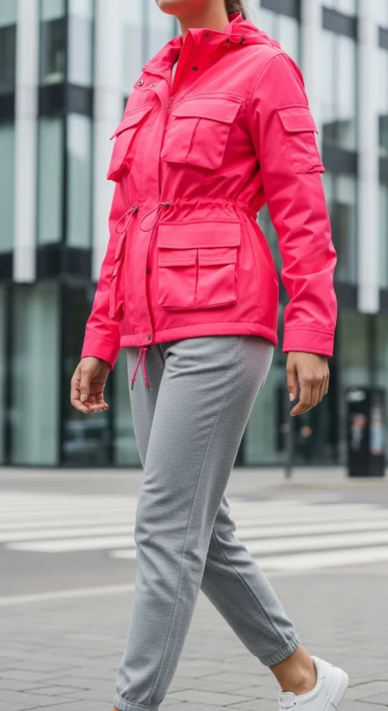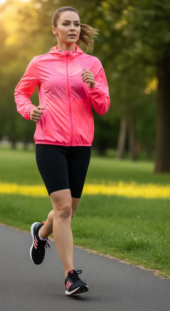 For high-energy activities, a neon pink windbreaker is a perfect choice. It provides visibility and style while you are on the move. Pairing it with biker shorts keeps the look balanced and athletic.