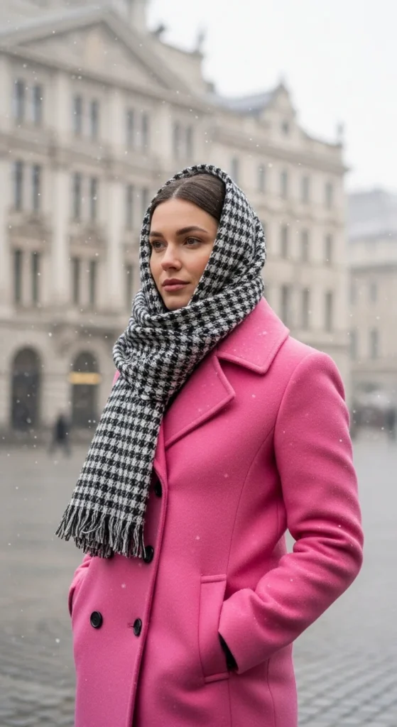 This is a timeless winter look. Pair with dark trousers and leather gloves for a polished appearance. The pink coat ensures you look cheerful and stylish even on the coldest, greyest winter days.