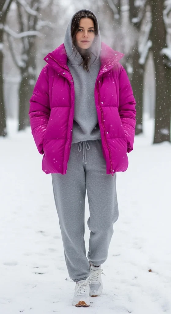 Staying warm does not mean you have to wear dull colors. A fuchsia puffer jacket turns a functional winter piece into a fashion statement. It looks incredibly chic when worn over a charcoal or heather grey tracksuit.