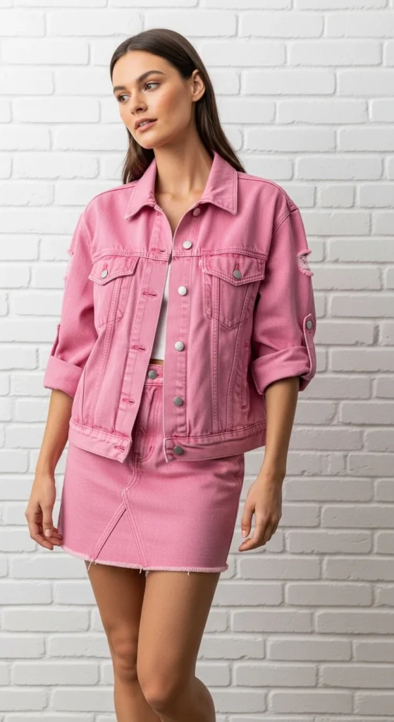 The “total look” or matching set is a major trend. A pink denim jacket paired with a matching skirt creates a cohesive, high-fashion appearance with very little effort. It is a fun twist on the classic denim-on-denim look.
