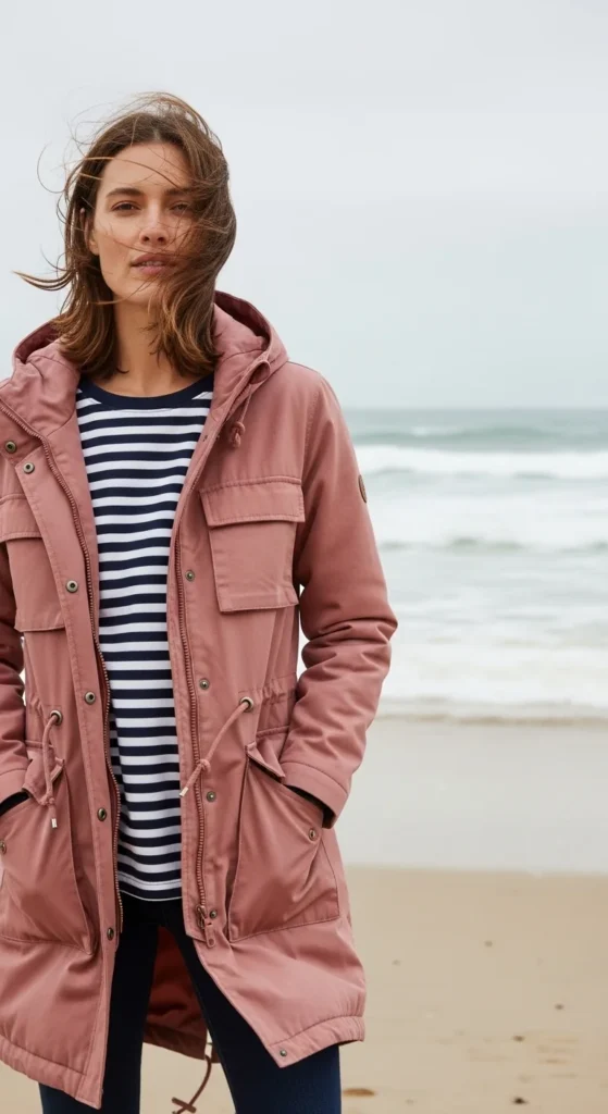 A dusty rose parka is a practical choice for rainy or windy days. The muted pink tone acts almost like a neutral, making it very easy to style. It pairs naturally with a classic navy and white striped top.