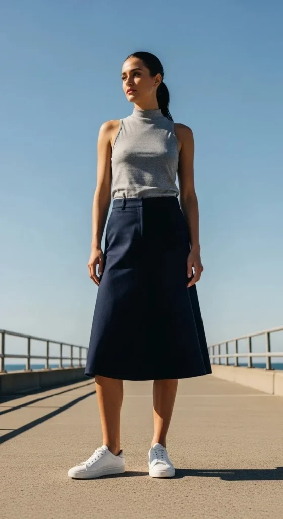 Embrace a sleek, minimalist aesthetic with this simple combination. Choose a structured navy blue skort with clean lines and no excess detailing. Pair it with a well-fitted, quality tank top in a neutral heather grey. Tuck the tank top cleanly into the skort to maintain a streamlined silhouette. This outfit is understated, chic, and incredibly easy to pull together. Finish with minimalist white leather sneakers or simple flat black sandals. This look relies on basic staples, so check your closet first – you likely already own a grey tank. Budget stores offer affordable, simple skorts that work perfectly for this clean, fuss-free style.