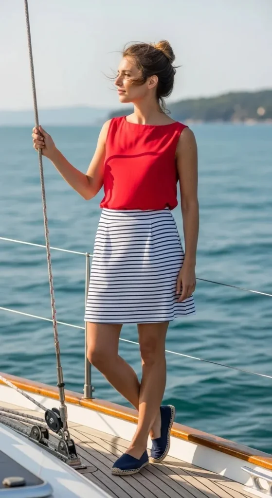 Achieve a classic nautical look by centering your outfit around stripes. Opt for a white skort with navy blue horizontal stripes, or reverse it with a navy skort featuring white stripes. Pair it with a vibrant, solid red top – a simple tee, a tank, or even a boat-neck blouse will work beautifully. This color combination is timeless and always looks fresh for summer, especially near the water. Complete the maritime theme with navy or white espadrilles or boat shoes. Look for affordable cotton striped skorts which are often available during spring and summer collections at budget-friendly retailers.