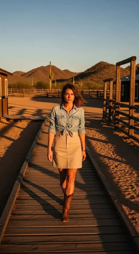 Add a touch of Western-inspired style to your wardrobe. A structured skort in twill or denim, particularly in shades of tan, brown, or white, serves as the perfect base. Pair it with a lightweight chambray button-down shirt. You can wear the shirt tucked in for a neater look or tie it at the waist for a more relaxed, casual feel. Complete the outfit with brown leather sandals or, for full Western flair, a pair of ankle cowgirl boots. Utilize a chambray shirt or any denim shirt you already own to easily achieve this stylish and adaptable outfit on a budget.