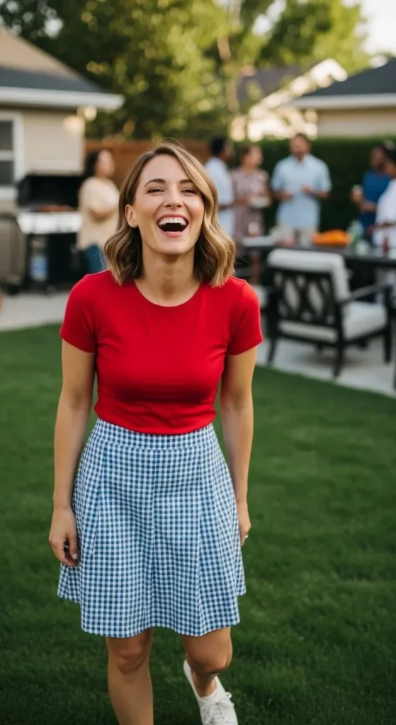 For a classic, casual summer gathering like a backyard BBQ, gingham is always a cheerful and appropriate choice. A gingham patterned skort, especially in blue and white or red and white, looks sweet and summery. Balance the busy pattern with a simple, solid cotton t-shirt that coordinates with one of the gingham colors. For shoes, stick with practical and comfortable options like white canvas sneakers or flat sandals. Gingham skorts are popular summer items and can often be found at very reasonable prices from multiple budget-friendly retailers, offering a simple and affordable way to achieve this classic look.