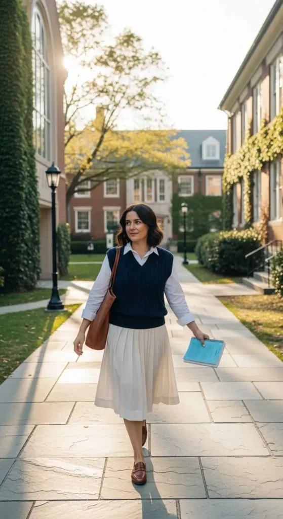 Create a preppy yet polished outfit by pairing a pleated skort with a sweater vest. This look is perfect for early autumn days or cooler summer evenings. Choose a cream, navy, or plaid pleated skort. Wear a simple, solid-colored knit sweater vest as your top, ensuring it fits well. You can wear it alone or layer it over a simple t-shirt if preferred. Complete the polished aesthetic with classic loafers or clean fashion sneakers. Sweater vests can often be found very affordably at thrift stores, making this a smart and budget-friendly way to style a pleated skort for a more elevated and collegiate-inspired look.
