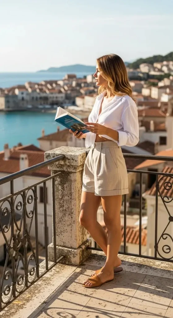Create an outfit that feels like you are on vacation, even if you are just heading to lunch. A clean, structured white skort is the quintessential resort wear piece. Pair it with a breezy, eye-catching printed blouse – think tropical florals, geometric patterns, or vibrant colors. Tucking the blouse in partially or tying it at the waist keeps the look relaxed and flattering. Finish with espadrilles, woven wedge sandals, or nice flat slides. White skorts are summer essentials easily found at every price point, making this sophisticated and breezy outfit achievable on a realistic budget.