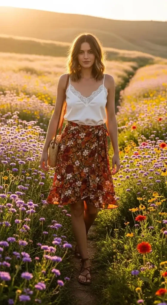 For a relaxed, bohemian feel, choose a skort in a fun, flowing fabric and a lively pattern, like florals, paisley, or geometric prints. A wrap-style skort works exceptionally well for this look. Pair it with a simple, delicate camisole in a solid neutral color that pulls from the skort’s pattern. The contrast between the busy bottom and simple top creates a balanced, airy outfit perfect for festivals, beach days, or warm evenings. Complete the look with strappy flat sandals or espadrilles. Look for affordable patterned skorts in rayon or thin cotton blends for that desirable flowy drape.