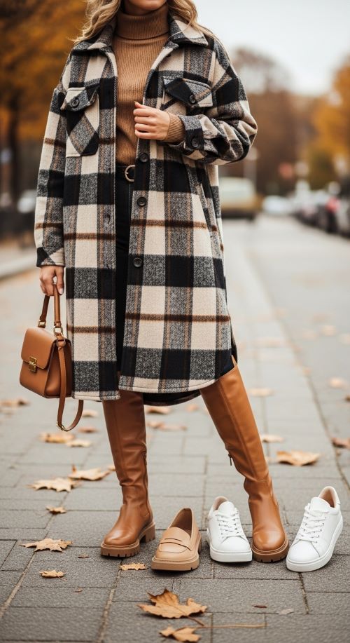 The right footwear completes your plaid outfit and reinforces the cozy fall aesthetic. Ankle boots, knee-high boots, loafers, chunky flats, or even sneakers can work depending on the vibe you’re going for.