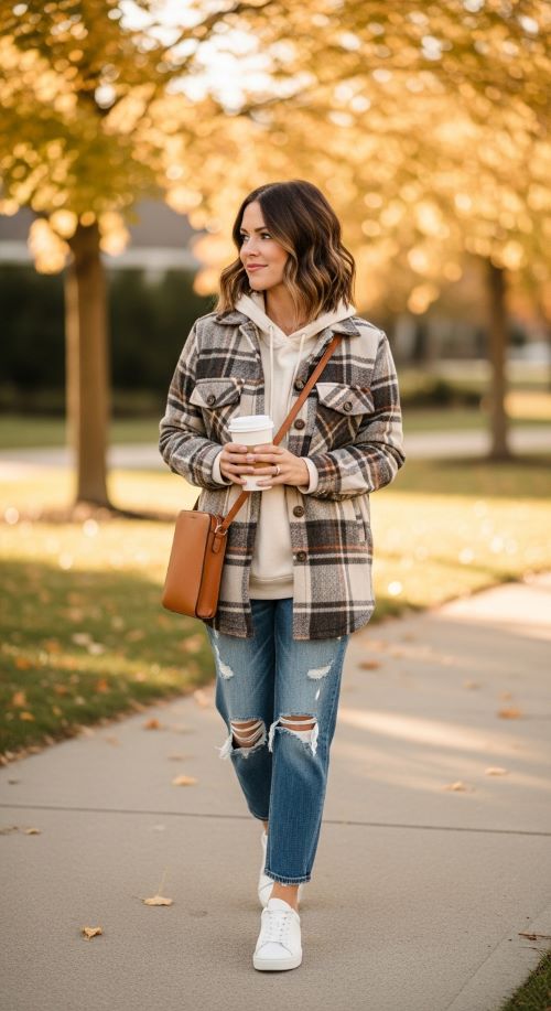 A plaid scarf instantly adds warmth and coziness, while a plaid tote or crossbody bag brings subtle visual interest to neutral outfits. Even plaid flats or loafers can elevate simple jeans-and-sweater combinations. Accessories are especially helpful if your wardrobe leans neutral and you want an easy seasonal refresh.