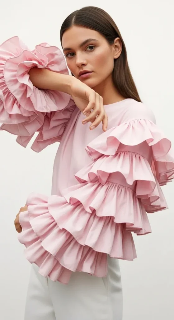 Tiered ruffles create massive volume down the entire length of the arm. They are bold, loud, and incredibly fun to wear. Choose stiff fabrics like taffeta to make the ruffles stand out.