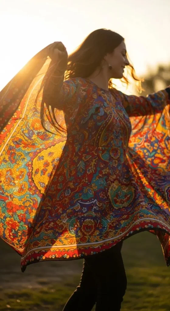 Batwing sleeves resemble dolman sleeves but feature even deeper armholes. When you raise your arms, the fabric creates a dramatic wing effect. Seek out loud, colorful prints to maximize the visual impact.