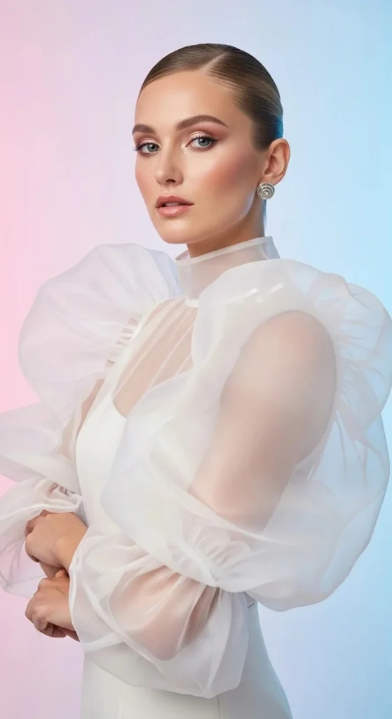 Organza puff sleeves look like clouds floating on your shoulders. The stiff, sheer fabric creates massive volume that stays firmly in place. Look for pastel shades for a whimsical, fairy-tale vibe.